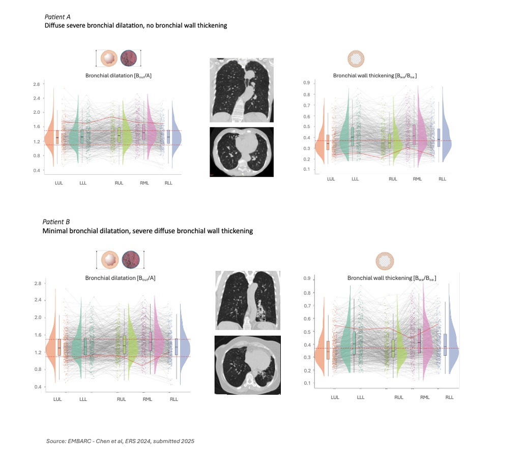 We can identify patients with predominantly mucus-dominated phenotypes versus those without mucus plugs but with severe wall thickening or subtle peripheral bronchial dilation. We can track disease activity over time and visualize the impact of a treatment at the segmental level. We no longer need to infer what’s happening – we can measure it.