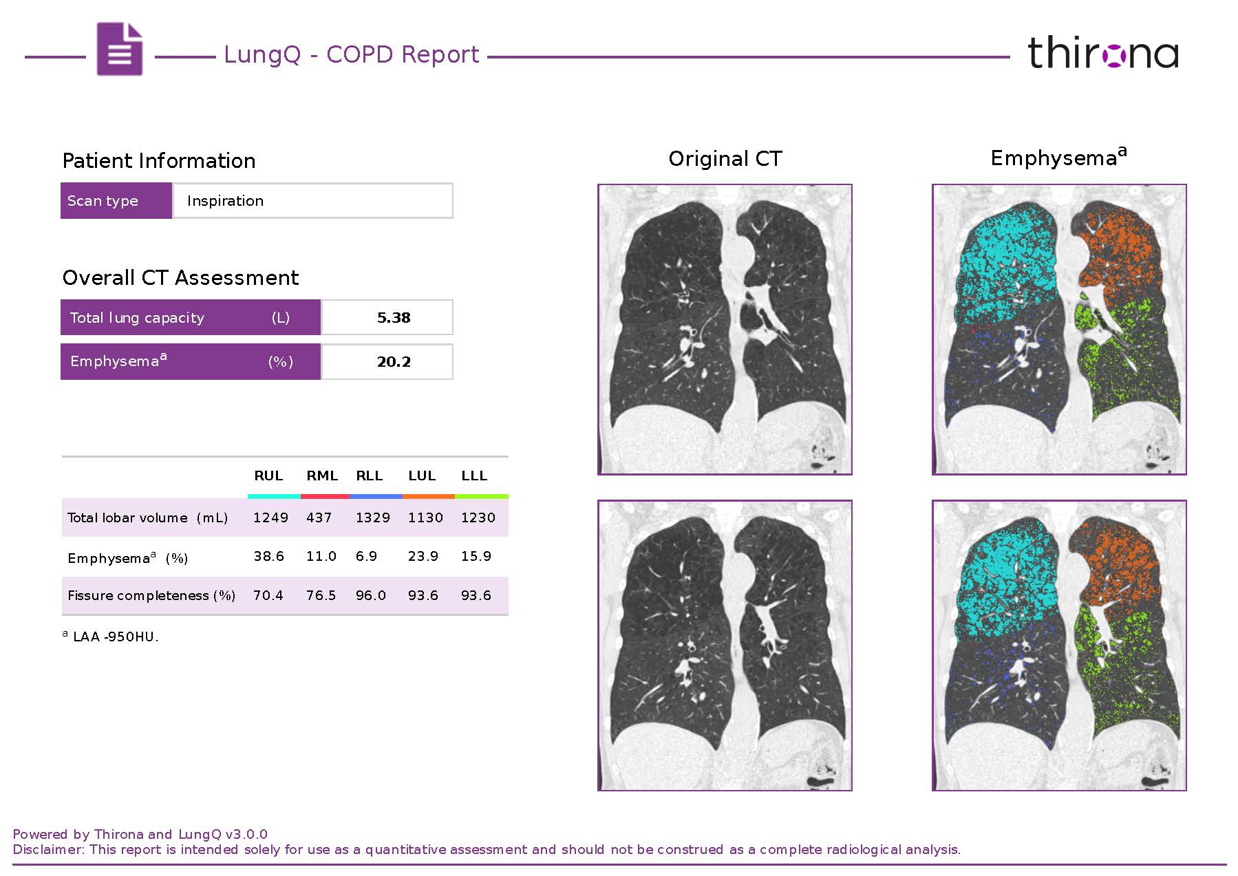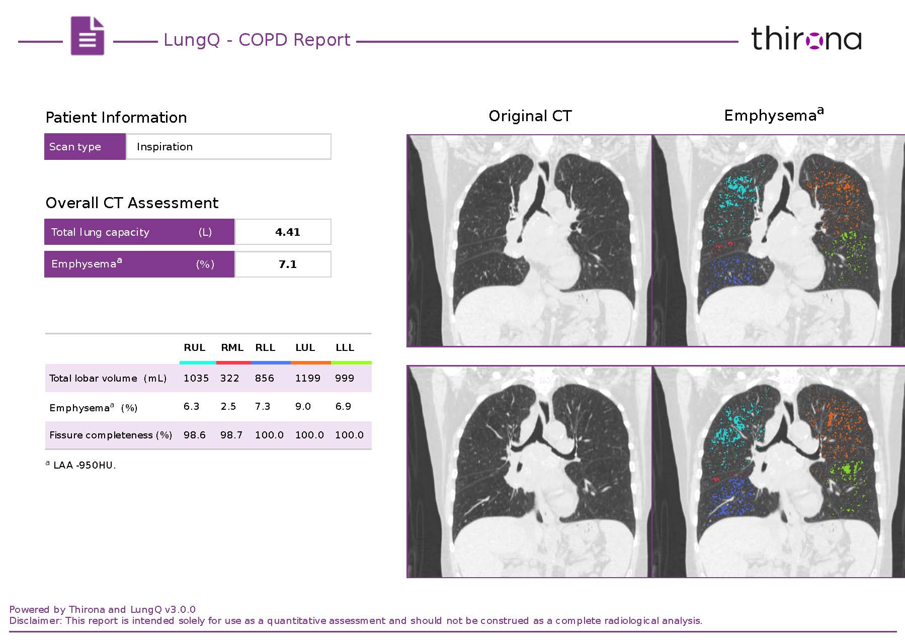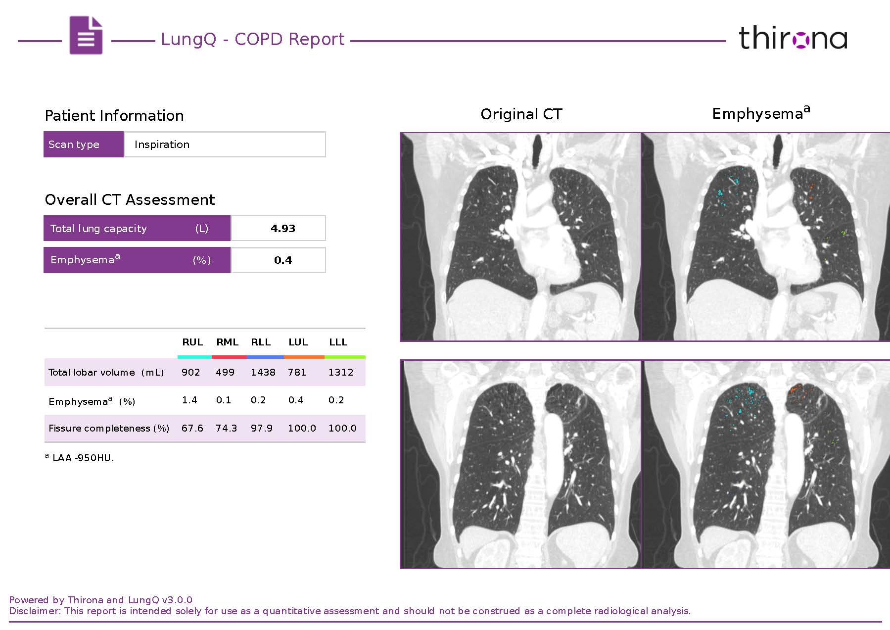 Below examples show automatically generated reports, including quantification of lung and lobar volumes, percentage of emphysematous lung tissue, and percentage of interlobar fissure completeness. Visuals of two representative slices show the localization of emphysema.